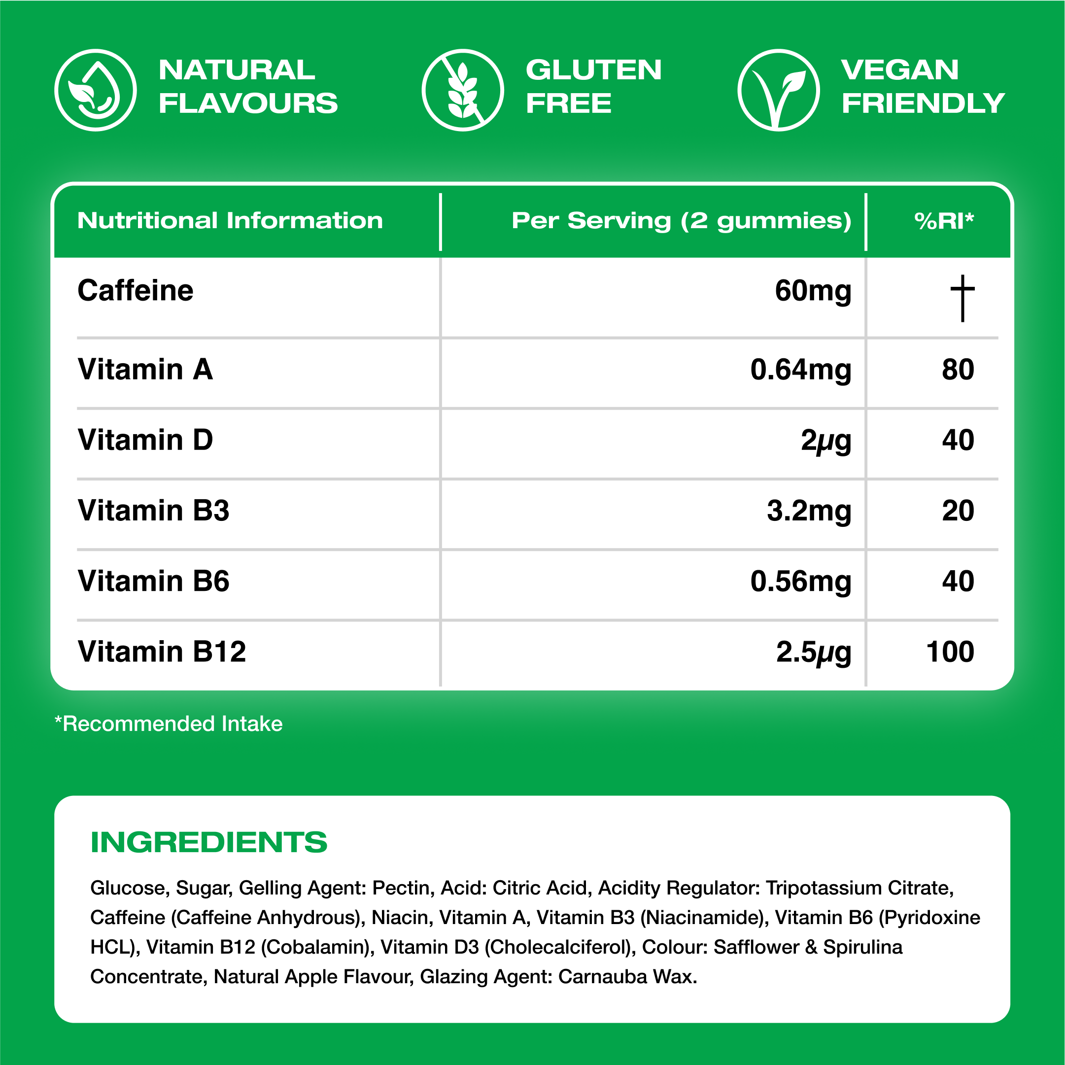 Natural stimulant found in tea and coffee. Works by stimulating the brain and central nervous system helping you stay alert and prevent the onset of tiredness.