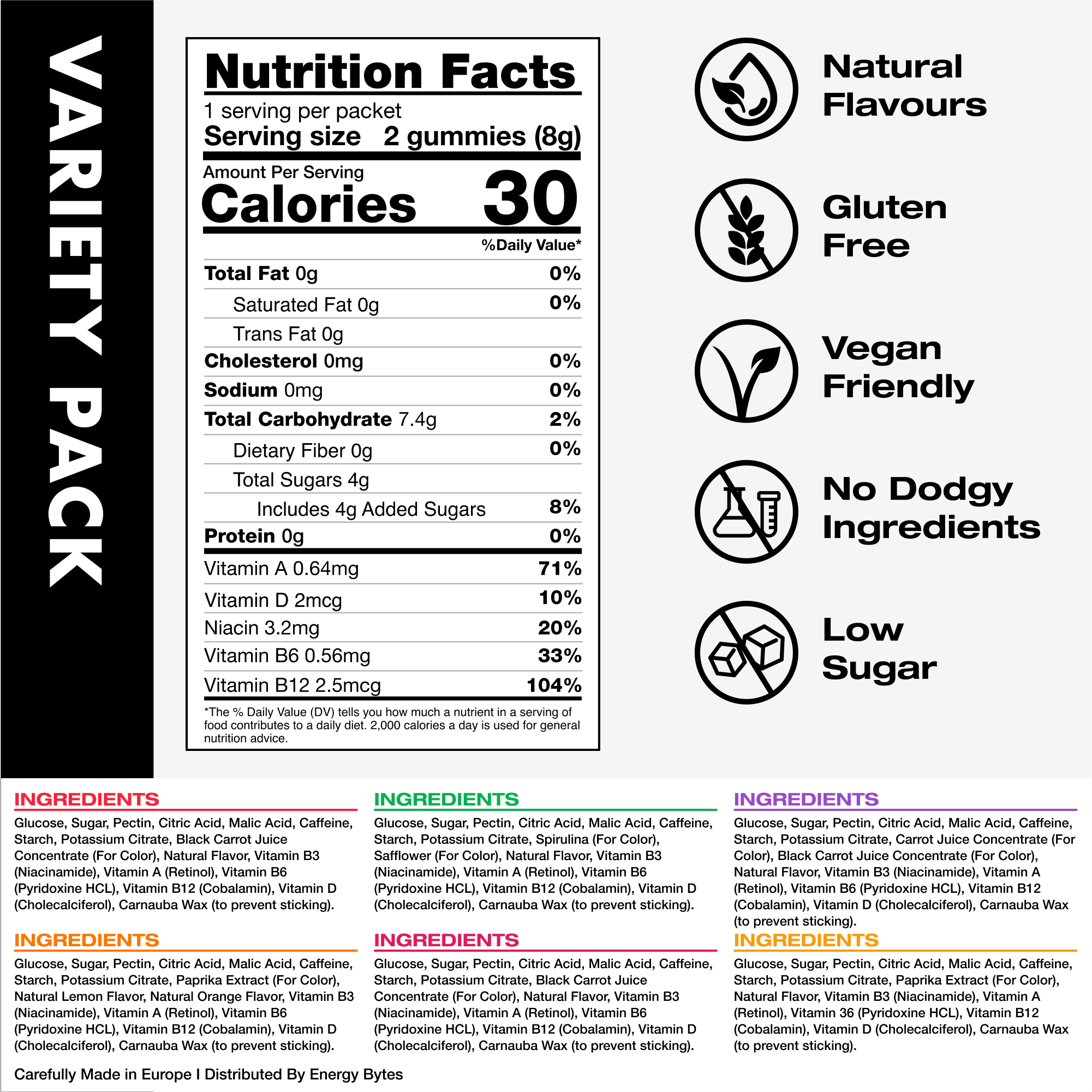 Unlike most other gummies on the market that are made with Gelatin, Energy Bytes are made with pectin from fruit peels, making them vegan-friendly.